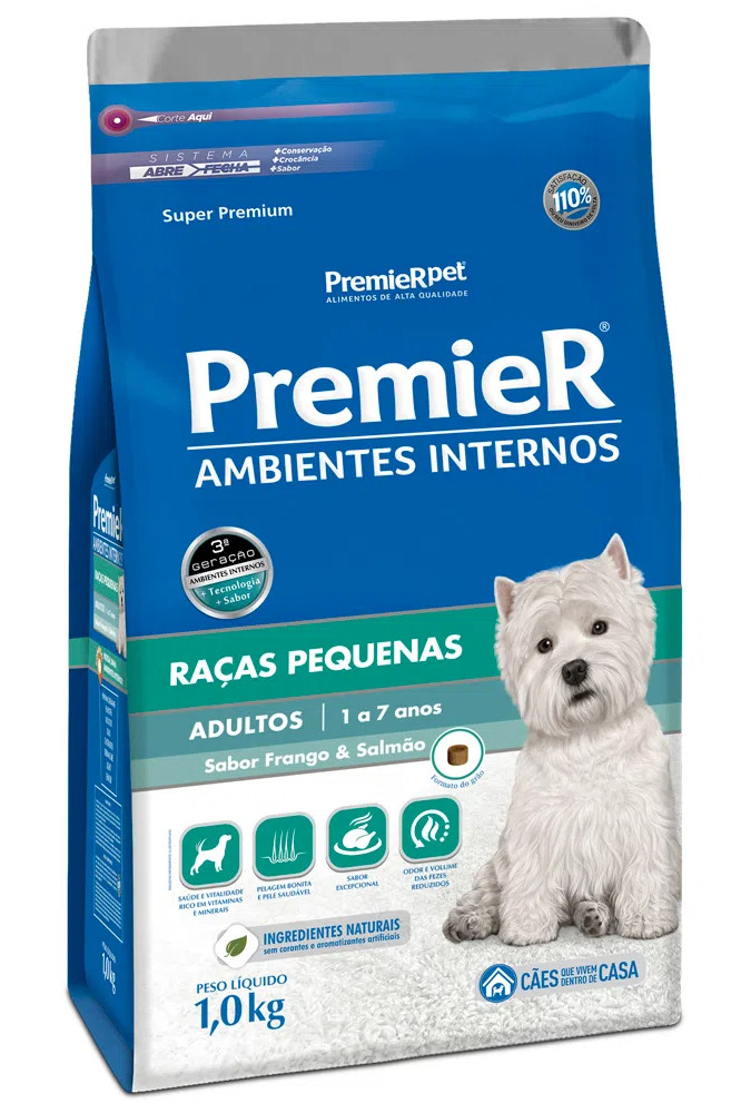 A PremieR Ambientes Internos Adultos no sabor de frango e salmão é o primeiro alimento Super Premium específico para cães com este estilo de vida de ambientes interno.