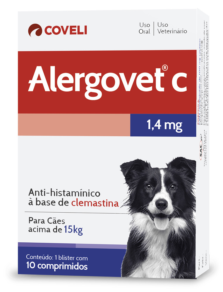 Alergovet C é um Anti-histamínico seguro em uso prolongado. Indicado no controle dos estados alérgicos tipo: prurido, urticária, dermatite alérgica e picadas de insetos, com uma resposta terapêutica rápida, o efeito faz-se sentir entre 20 e 45 minutos após a administração oral.