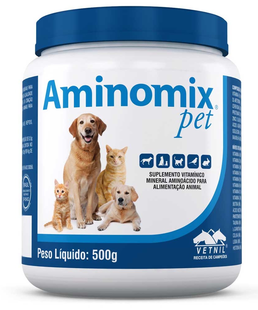 Aminomix suplemento vitamínico em pó, mineral, aminoácido para alimentação para caninos, felinos, aves, répteis, mustelídeos e roedores.